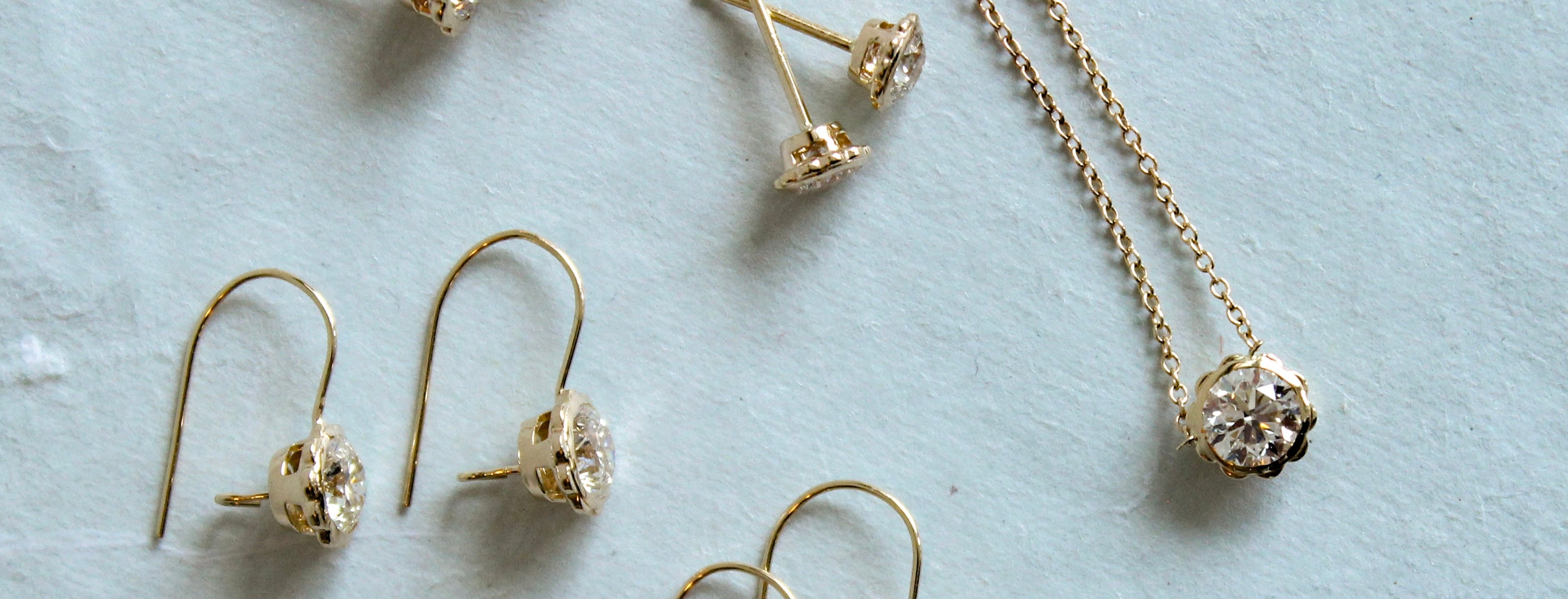 Created in collaboration between SJ Bailey Co. and Mary Frances Maker, each piece in this collection is crafted in solid gold and features a natural solitaire diamond framed by a delicate scalloped trim — our vision of modern heirlooms and timeless femininity.