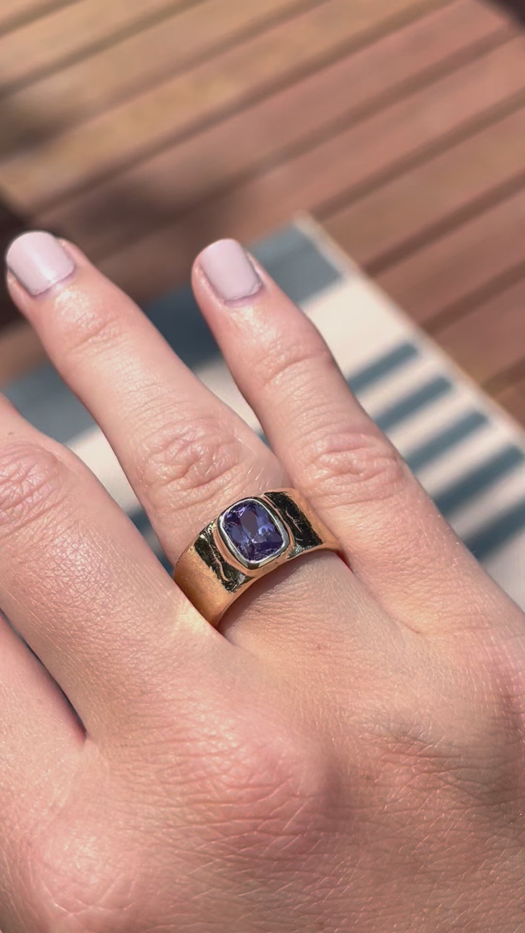 Offered in exquisite 14k yellow gold, this one-of-a-kind Cigar Band Ring is a luxurious statement piece. Handcrafted to perfection, this 10mm wide band shines with a gorgeous lavender sapphire to make a truly stunning piece. Bring a touch of sophistication to your wardrobe with this remarkable ring.