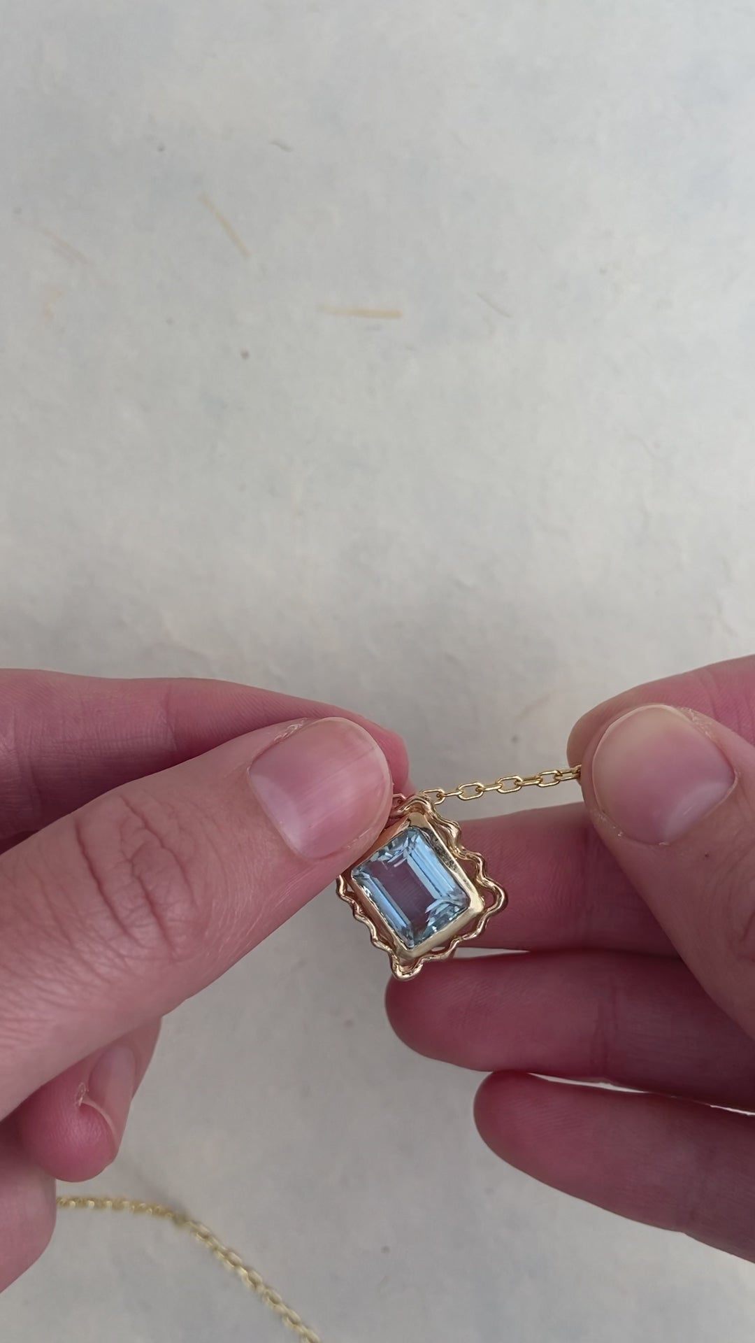 Channel your inner designer with this elegant Wavy Frame Necklace. Inspired by interior details such as wavy trimmed mirrors, lampshades, rugs, this warm and inviting necklace is the perfect frame for a statement-making gemstone like our soft blue emerald-cut aquamarine.